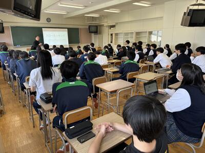 生徒達も真剣な様子で、一生懸命メモを取りながら話を聞いていました。普段の言葉遣いや挨拶・服装が大切であること、社会に出ると1つ1つの行動に責任を伴うということを学ぶことができました。