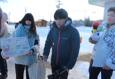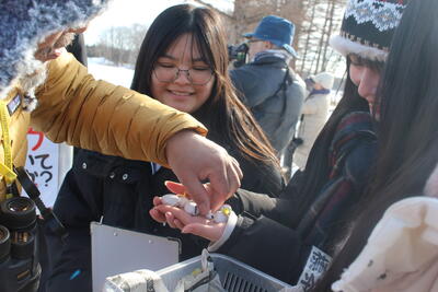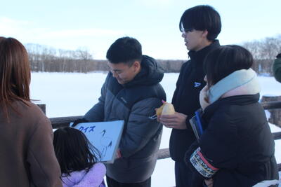 1月25日(土)に鶴居村にある鶴居・ 伊藤サンクチュアリと鶴見台にて本校生徒がタンチョウガイドを実 施しました。タンチョウの生態や保護の歴史、文化などを、 手作りのフリップや小道具を使って観光客の皆様に説明しました。